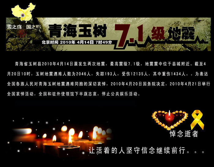 新華社4月20日電 為表達(dá)全國各族人民對(duì)青海玉樹地震遇難同胞的深切哀悼,國務(wù)院決定,2010年4月21日舉行全國哀悼活動(dòng),全國和駐外使領(lǐng)館下半旗志哀,停止公共娛樂活動(dòng)。