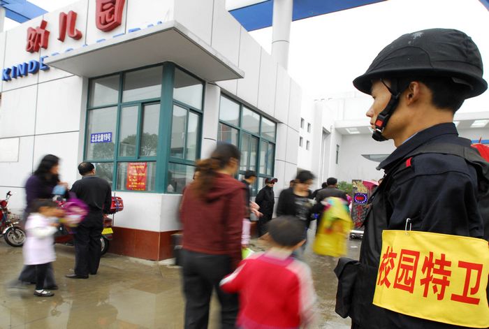名配備鋼盔、防刺服、防割手套、防暴膠棒、滅火槍、催淚器等防護(hù)裝備的專職校園特衛(wèi)人員開始進(jìn)駐市直
