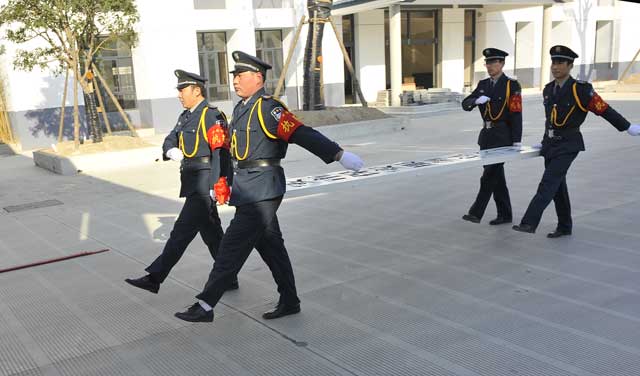 雖然室外氣溫格外寒冷,但這里卻充滿了春天的氣息。上午9時50分,4名禮儀保安抬著一塊披著紅綢的標牌, 邁著整齊的步伐走向公司大門,9時58分,江蘇省淮安市保安服務總公司標牌緩緩地、平穩(wěn)地掛了起來,現(xiàn)場響起陣陣鞭炮聲和熱烈的掌聲,大家共同為總公司新址掛牌而歡欣鼓舞。