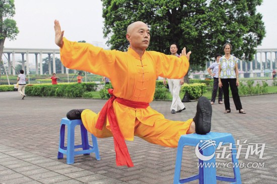 “農(nóng)民工組合”中的武者張中心來(lái)自河南孟州,體魄結(jié)實(shí),剃著光頭,頗有點(diǎn)少林寺武僧的范兒。張中心告訴記者,自己出生在有著“武術(shù)之鄉(xiāng)”之稱的孟州化工鎮(zhèn),從小就對(duì)武術(shù)癡迷。與王文正一樣,張中心同樣從小家境貧寒,早年父親得了精神病,家里沒(méi)了頂梁柱,張中心也是小學(xué)沒(méi)畢業(yè)便輟學(xué)了,兄妹三人都是母親一人拉扯大。由于父親精神病發(fā)作,出去惹了不少事,遭到了鄰居的不解和謾罵,兄妹幾個(gè)也常被欺負(fù),于是張中心暗下決心,學(xué)好武術(shù),保護(hù)家人不被欺負(fù)。說(shuō)到這,張中心覺(jué)得自己走上習(xí)武之路的初衷有些偏頗,“習(xí)武之人不可為一己之私,以怨報(bào)怨,有違武術(shù)之道,所以現(xiàn)在打算免費(fèi)傳授一些武術(shù)給大家,當(dāng)做健身之道。”