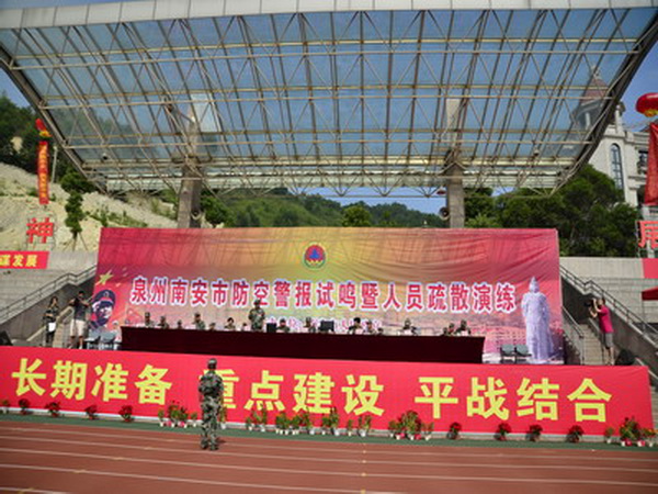 “我宣布,泉州南安市防空警報試鳴暨人員疏散演練開始!”隨著演練指揮長南安市人民政府常務(wù)副市長劉敏堅發(fā)布命令,警報急促鳴響,操場上的各單位演練人員和600多名的實驗中學(xué)師生迅速向指定防空地下室疏散掩蔽;隨后,現(xiàn)場各專業(yè)隊按照計劃和程序開展救援、救護、消除空襲后果的各種演練和演示活動。本次演練除了南安實驗中學(xué)這個主會場,還有分會場市區(qū)3個街道辦事處及15個重點鎮(zhèn)參與演練。