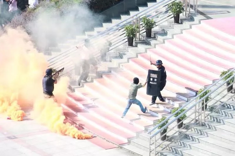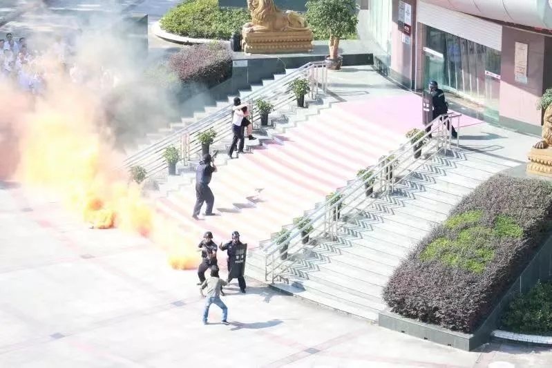 演練現場,3名“歹徒”在接近押運人員時快速丟出煙霧彈制造混亂,現場群眾驚叫連連,四散逃開,“持槍歹徒”開槍射擊,一名持槍押運員受傷倒地……