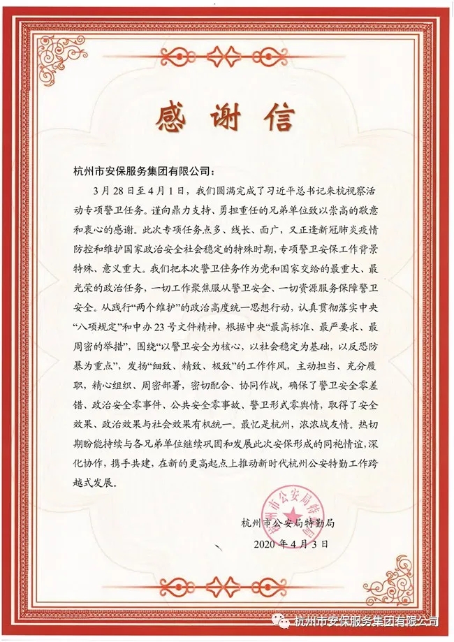 2020年3月29日至4月1日,習(xí)總書記來杭視察調(diào)研。杭州市安保服務(wù)集團(tuán)有限公司根據(jù)浙江省公安機(jī)關(guān)和特勤局要求,承擔(dān)此次重大安保任務(wù)。公司高度重視,迅速組建以公司黨委書記、董事長(zhǎng)鄭雪林為組長(zhǎng)的專項(xiàng)安保小組,在省市特勤局,屬地公安部門及相關(guān)單位的領(lǐng)導(dǎo)下,圓滿完成了習(xí)總書記在浙江調(diào)研期間的各項(xiàng)安保任務(wù)。