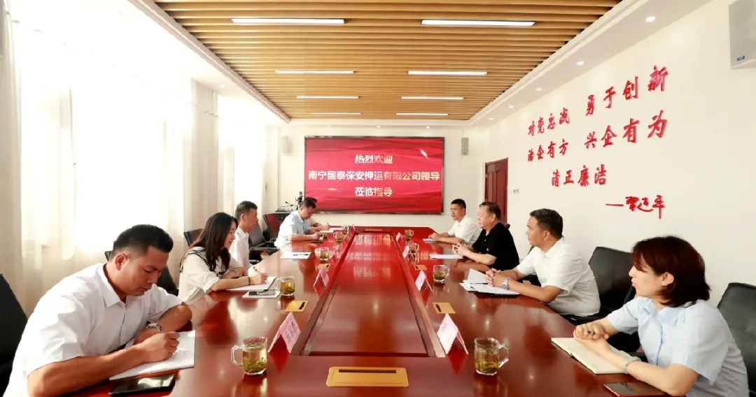7月8日,南寧國泰保安押運有限公司總經(jīng)理羅來明、副總經(jīng)理趙佩翔等一行5人到山東泰山保安服務(wù)有限公司進行考察交流。泰山保安總經(jīng)理王鐵鋒、副總經(jīng)理丁國民陪同調(diào)研并進行座談交流。