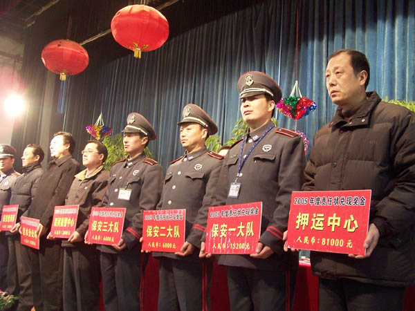 元月22日上午,總公司隆重召開“責(zé)任狀兌現(xiàn)暨春節(jié)安保工作會議”,會議對完成2005年任務(wù)指標(biāo)的9個(gè)部門受狀人頒發(fā)了責(zé)任狀獎金,并對春節(jié)安全保衛(wèi)工作作了部署。武裝押運(yùn)中心、保安大隊(duì)及各部門300余人參加了會議。