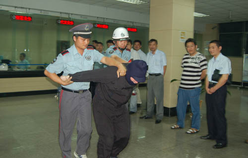 7月23日上午6時(shí)許,市區(qū)一家銀行營(yíng)業(yè)大廳內(nèi),兩名手持炸藥包的“歹徒”突襲銀行工作人員并索要錢物,銀行保安與之發(fā)生了激烈搏斗,瞬間“歹徒”被勇敢的保安員“擒獲”。當(dāng)日,江蘇銀行淮安支行與市保安公司開展的多課目反搶劫演練,進(jìn)一步提高了保安員處置突發(fā)事件的能力。