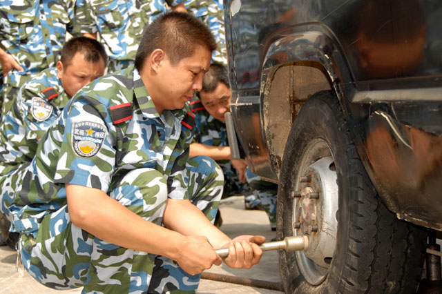 2008年8月3日上午,一名押運(yùn)駕駛員在爭(zhēng)分奪秒地更換輪胎。當(dāng)日,淮安保安總公司舉行了運(yùn)鈔車駕駛員技能大比武,來自市區(qū)的50余名運(yùn)鈔車駕駛員冒著酷暑進(jìn)行了障礙駕駛、更換輪胎、車輛故障排除等駕駛技能的角逐。