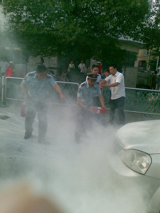 當(dāng)天,健康東路上一輛蘇AV486白色別克轎車在行駛至市財政局門前時車頭突然冒煙,隱約有明火竄出,引來路邊很多市民圍觀,正在市財政局開會的保安大隊長薛松發(fā)現(xiàn)后,立即帶隊員尚月龍?zhí)嶂鴾缁鹌髭s到現(xiàn)場,一邊疏散周圍路人和過往車輛。一邊用滅火器進(jìn)行撲救,由于撲救及時,該車損失不大。