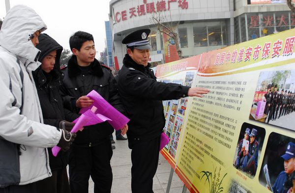 元月10日,是公安機(jī)關(guān)110宣傳日。當(dāng)日,總公司辦公室組織保安管理部、駐外保安部、押運中心、培訓(xùn)部、技術(shù)防范部等部門,與公安機(jī)關(guān)一起在古順河體育館門前開展《保安服務(wù)管理條例》宣傳活動,通過拉橫幅、放展板、散資料等方式,廣泛宣傳保安條例,接受市民咨詢,深層次了解群眾對保安工作的需求和意見。