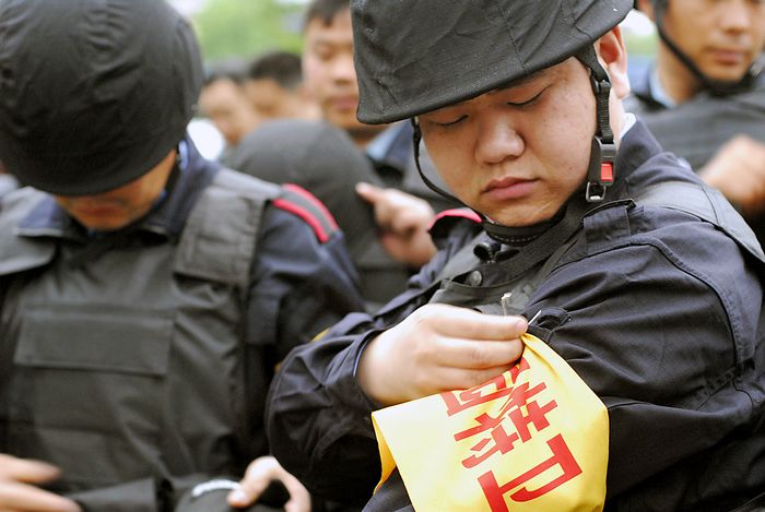 2010年5月5日早晨6時許,全副武裝的校園特衛(wèi)人員整裝待發(fā)。自當(dāng)日起,江蘇省淮安市首批46名配備鋼盔、防刺服、防割手套、防暴膠棒、滅火槍、催淚器等防護(hù)裝備的專職校園特衛(wèi)人員開始進(jìn)駐市直23所中小學(xué)和幼兒園,守護(hù)校園平安。這些人員都是從全市保安隊(duì)伍中精選出來的骨干,年齡在35歲以下,大都有部隊(duì)服役的經(jīng)歷,身體素質(zhì)和政治素質(zhì)較好,且受過專業(yè)訓(xùn)練。