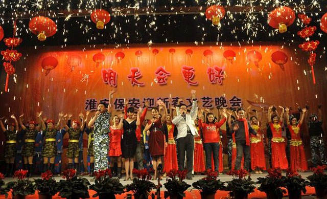 整場晚會(huì),都是各部門員工自編自演,以自娛自樂為主。機(jī)關(guān)女職工帶來的舞蹈《印度新娘》,用優(yōu)美的舞姿展示了她們昂揚(yáng)向上的精神風(fēng)貌。保安部編排的節(jié)目《鬧春》則另辟蹊徑,八位由小伙子反串的老太太步履蹣跚卻充滿風(fēng)趣,將那一份喜迎新春的歡樂散播到每一個(gè)人身上。機(jī)關(guān)男職工編排的舞蹈《窮開心》和劍蘭賓館的女員工的《拉丁舞》也博得滿堂喝彩。武裝押運(yùn)中心的舞蹈《當(dāng)祖國召喚的時(shí)候》將晚會(huì)推向了一個(gè)高潮,十位頭戴鋼盔、身著迷彩服、手持鋼槍的押運(yùn)隊(duì)員邁著鏗鏘有力的步伐宣誓他們的忠誠與剛毅,展現(xiàn)了武裝押運(yùn)員的風(fēng)采和雄姿。