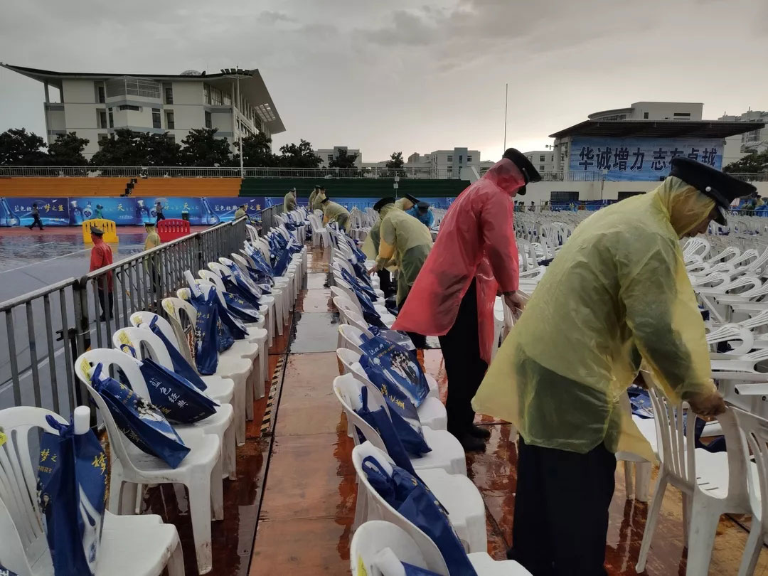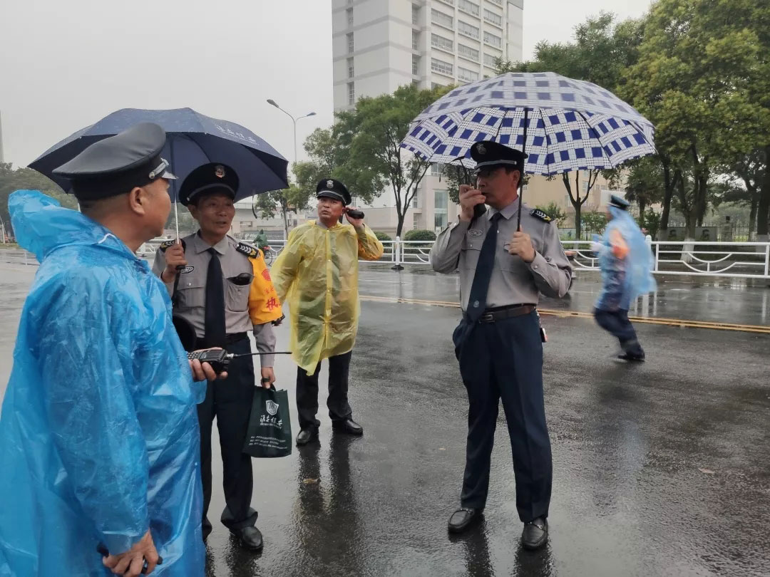 7月6日下午15點(diǎn),晚會(huì)現(xiàn)場(chǎng)暴雨來臨,降雨量已超100毫米,雨勢(shì)持續(xù),并伴有雷暴天氣。由于惡劣天氣影響,加上持續(xù)暴雨,部分道路積水嚴(yán)重,給觀眾入場(chǎng)帶來安全隱患??偣玖⒓磫?dòng)災(zāi)害天氣應(yīng)急預(yù)案,行政部門迅速出動(dòng),發(fā)放雨衣。人防管理中心組織全體保安隊(duì)員,在重要路口指揮疏導(dǎo),采取定人、定崗、定責(zé)的預(yù)防措施,全體保安隊(duì)員在暴雨中堅(jiān)守崗位,認(rèn)真做好崗位工作。