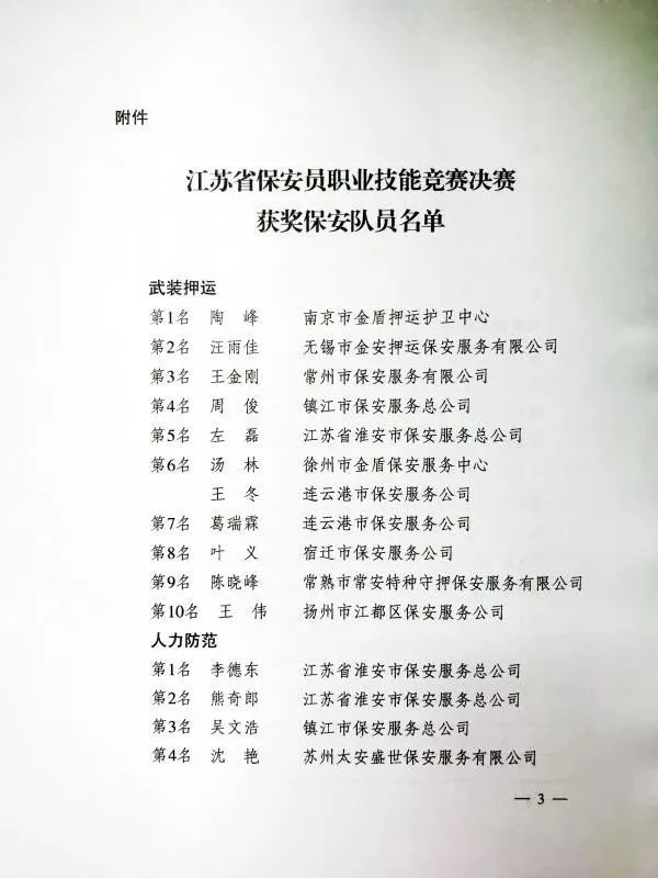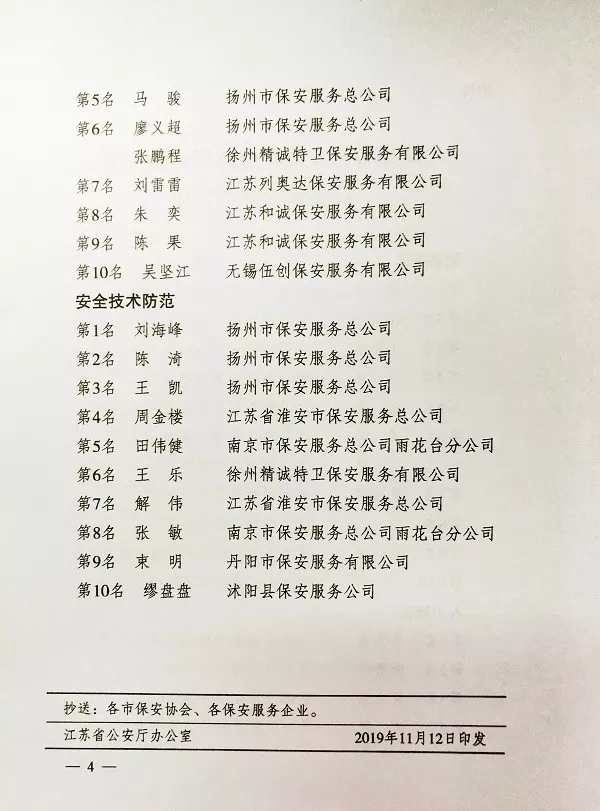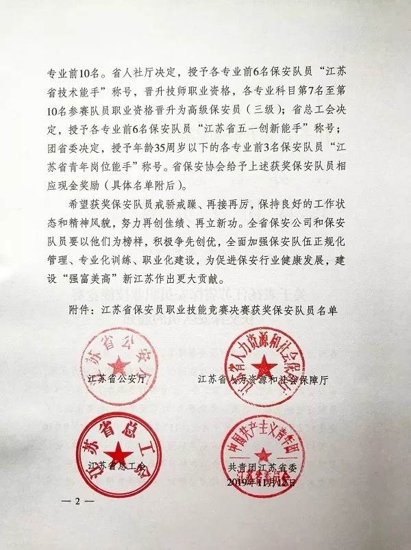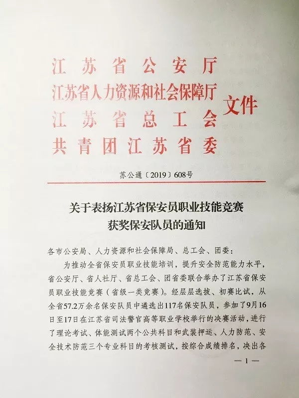 11月12日,江蘇省公安廳、江蘇省人力資源和社會保障廳、江蘇省總工會、共青團(tuán)江蘇省委聯(lián)合發(fā)文,祝賀、表揚(yáng)獲獎(jiǎng)保安員,并對各科目進(jìn)入前六名的獲獎(jiǎng)人員分別授予“江蘇省技術(shù)能手”、“江蘇省五一創(chuàng)新能手”和“江蘇省青年崗位能手”榮譽(yù)稱號。