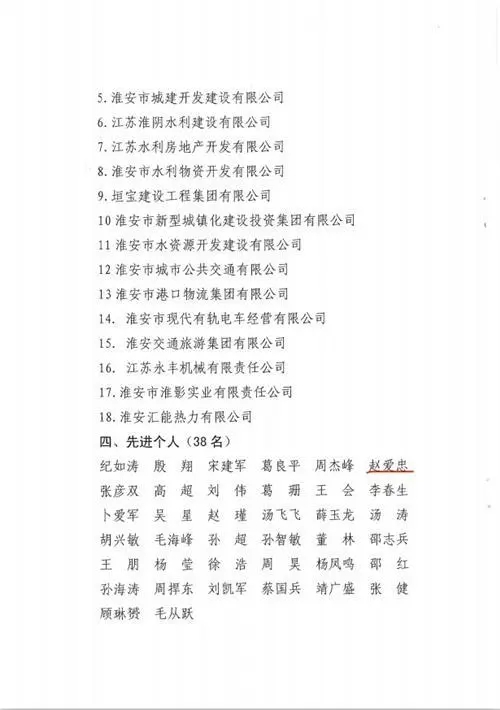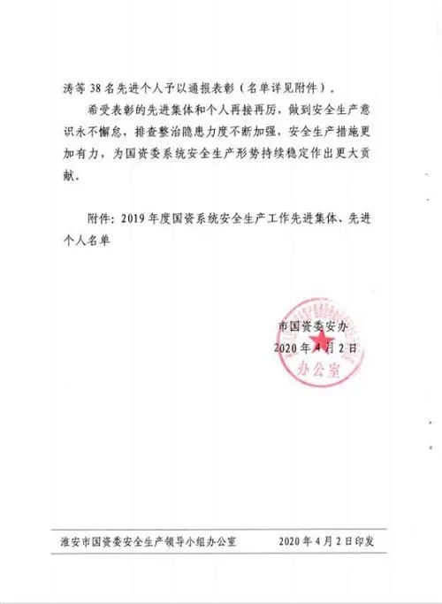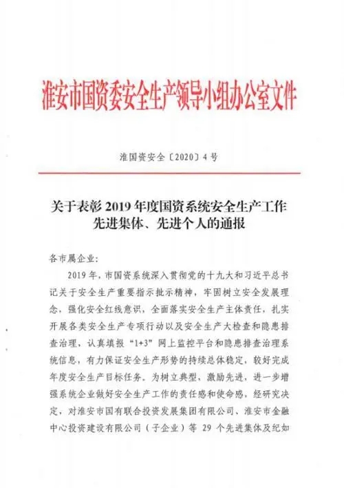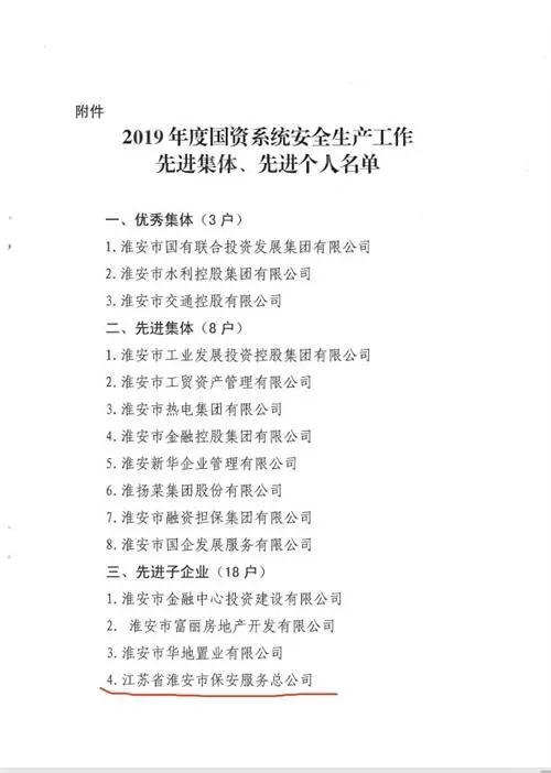 2020年4月2日,淮安市國資委通報表揚2019年度國資系統(tǒng)安全生產先進集體和個人,淮安保安以“零事故”“零隱患”表現榮膺先進集體。公司黨總支書記、總經理趙愛忠榮膺先進個人。